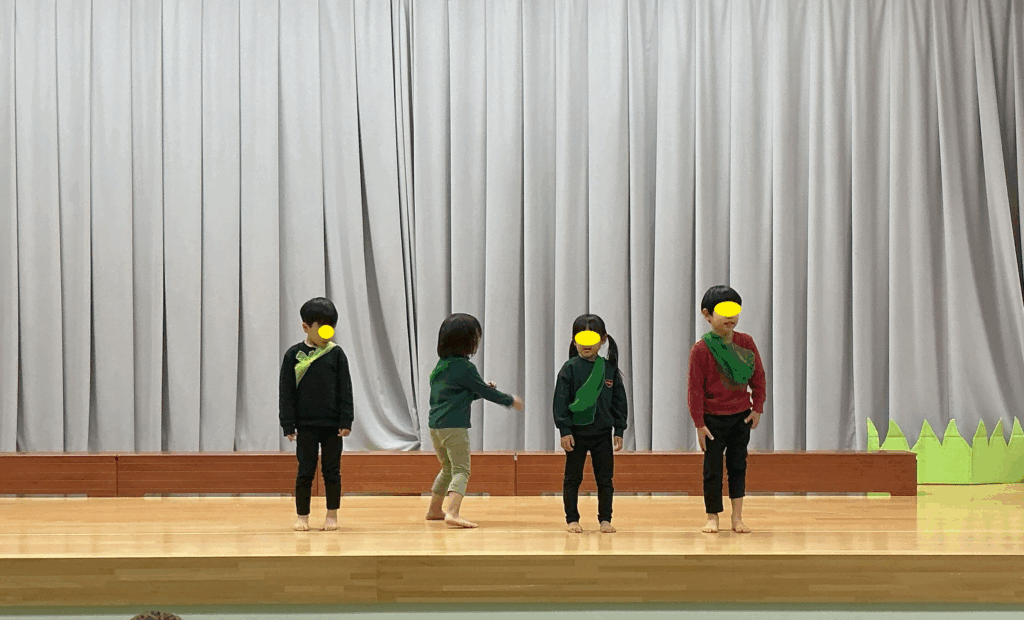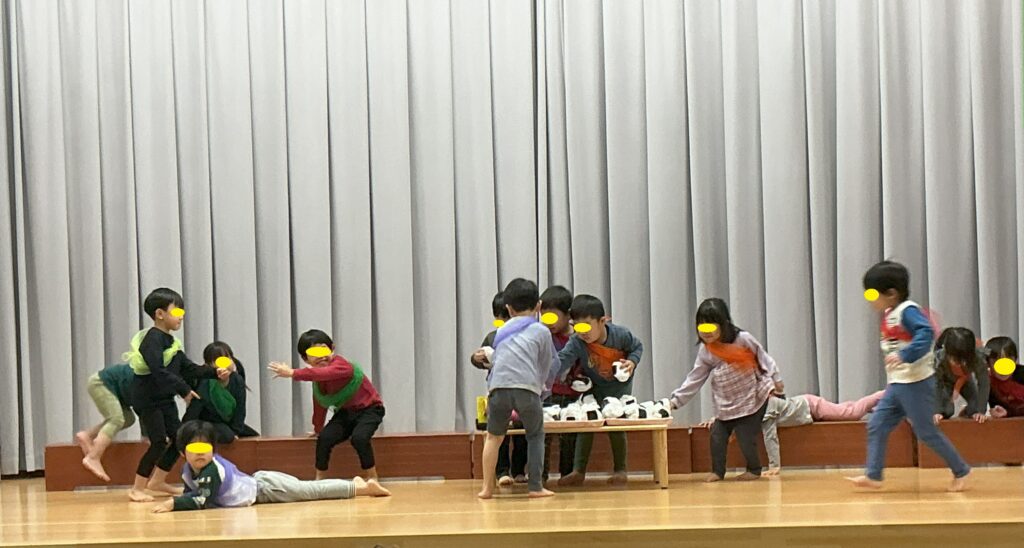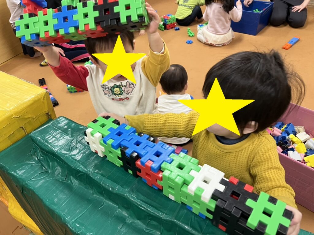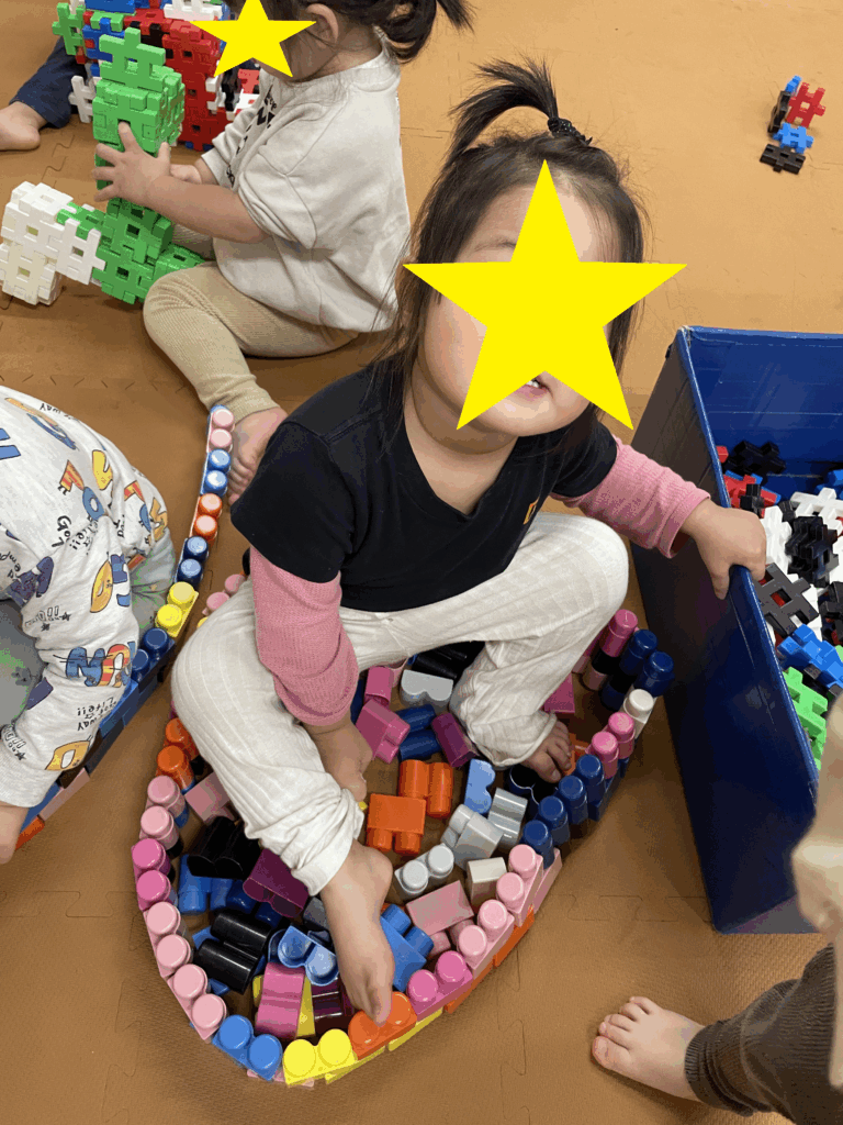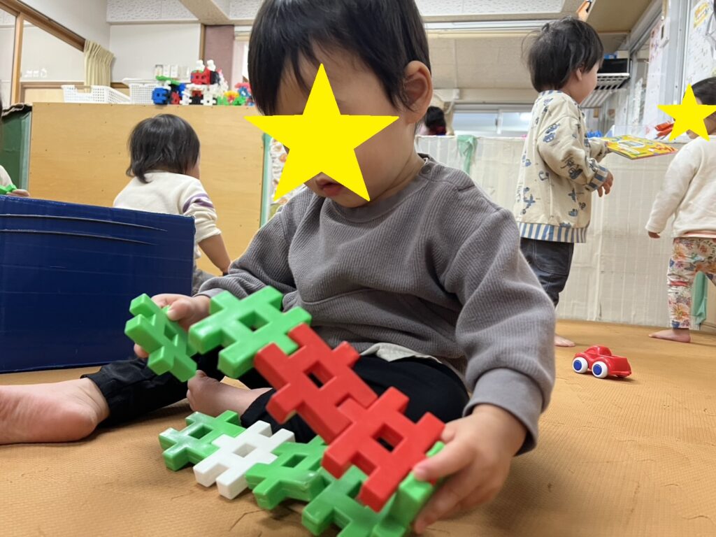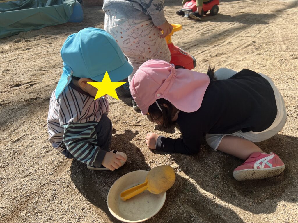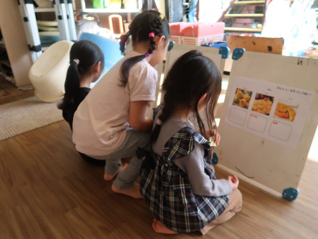 みんなでおままごとをして遊びました。自分で布やスカートなどを選んで身につけ、ご飯を作って友達や保育者に「どうぞ」「あーん」と言いながら食べさせてくれます。赤ちゃんの人形をとんとんして寝かせてあげたり、ご飯を食べさせてあげたりする姿は、まるで本物のお母さんのようでしたよ。