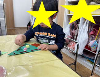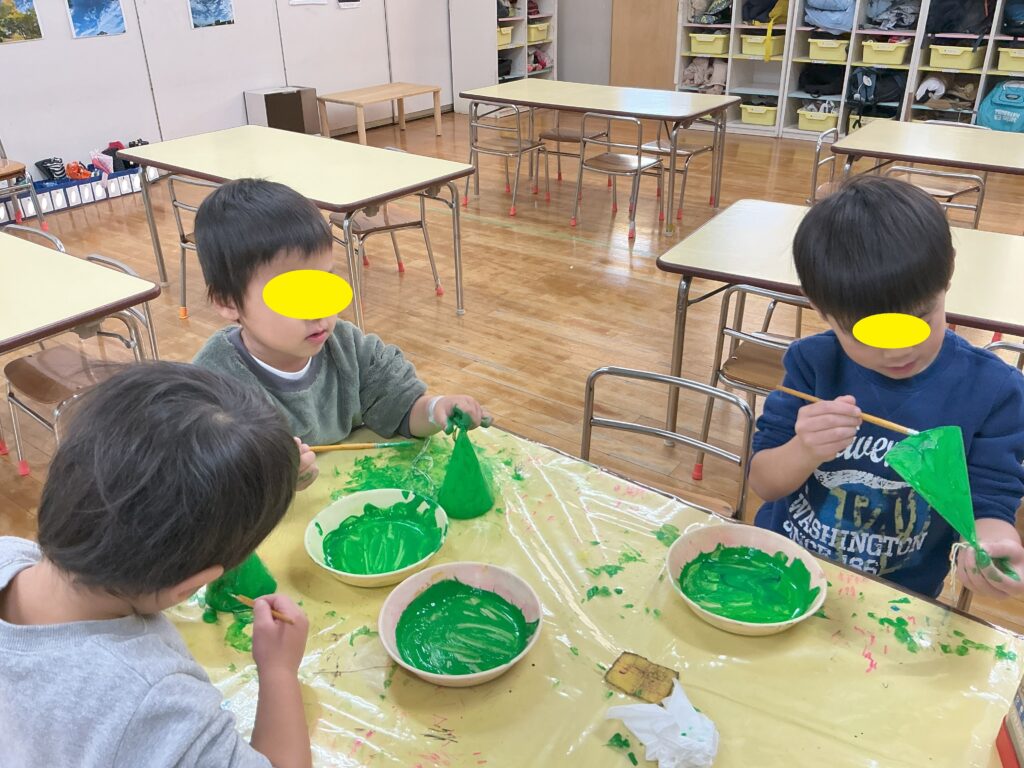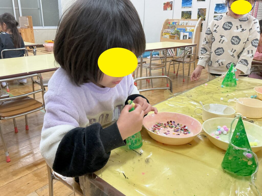 今月はクリスマス製作で、ツリーの形に切った画用紙に紐を通し、デコレーションボールなどで飾りつけをしました。初めてボンドも使いましたが約束事を守って楽しんで作っていましたよ。一人一人個性豊かなツリーが完成しました。