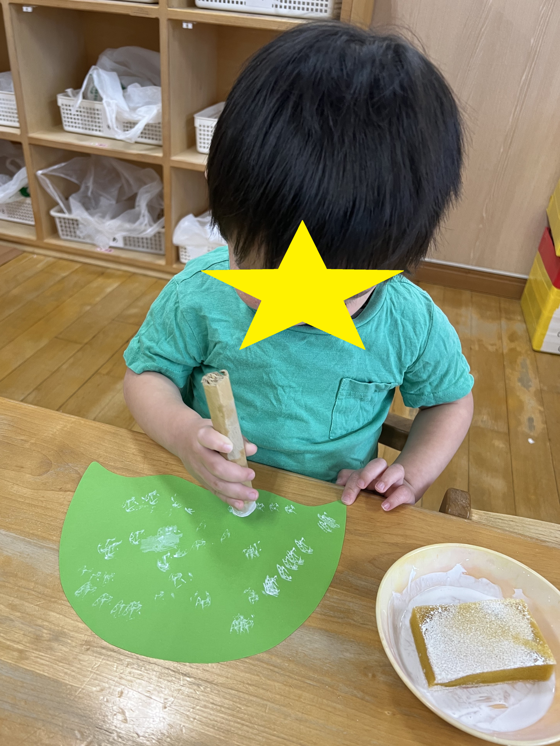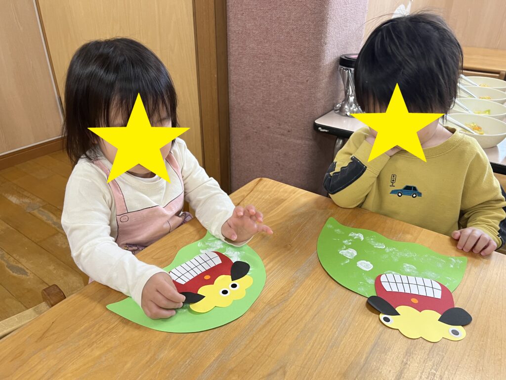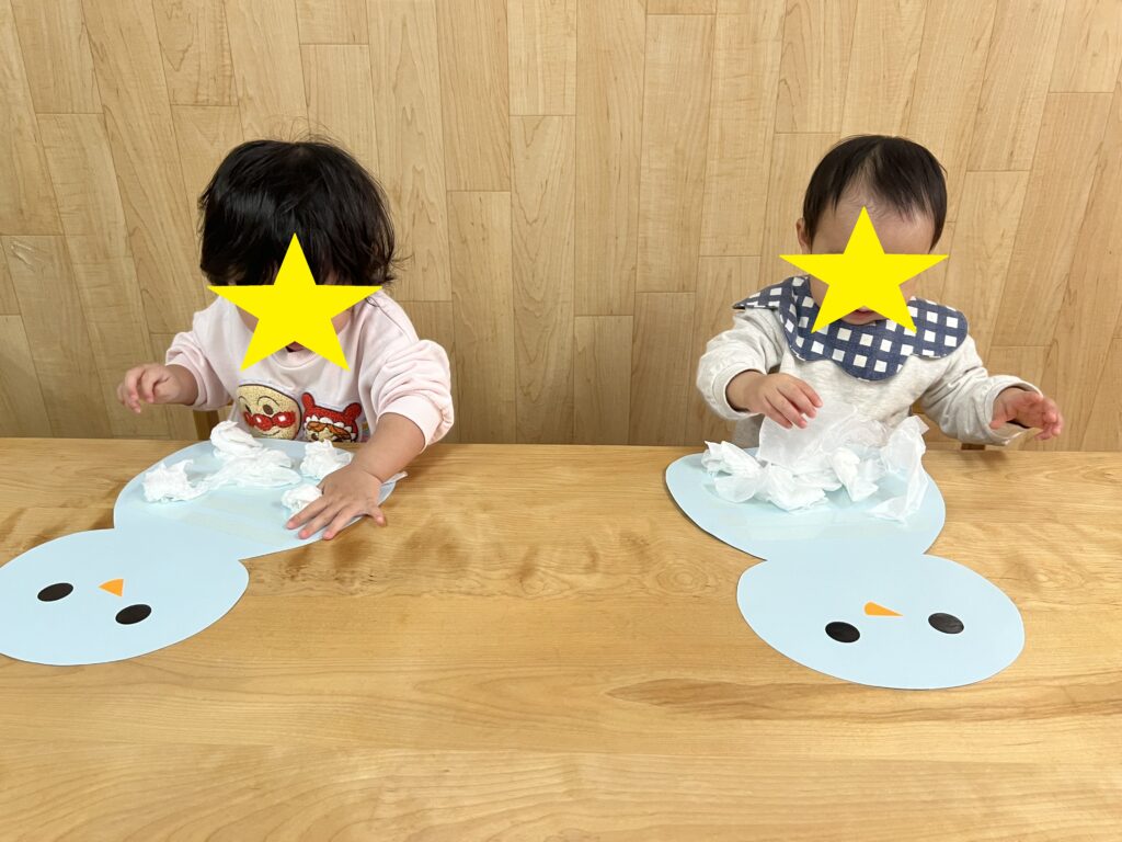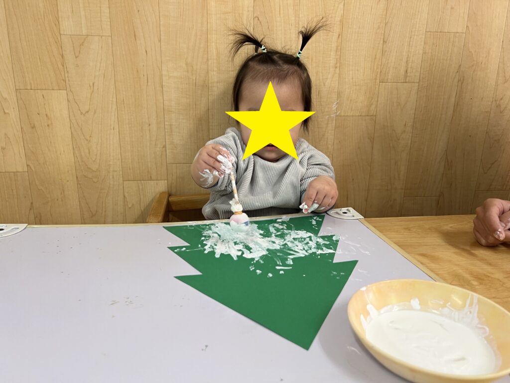 今月はえのぐとタンポという道具を使ってクリスマスツリーを作ったり、花紙を丸めたり破ったりして画用紙にくっつけてゆきだるまを作りました。えのぐや花紙の感触を楽しみ、かわいい作品ができあがりました!ゆきだるまは年明けに室内に飾る予定ですのでお楽しみに!ほかにも室内や園庭で元気いっぱい遊びました。