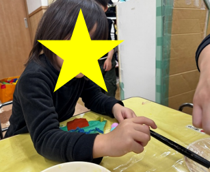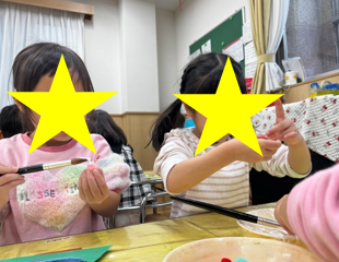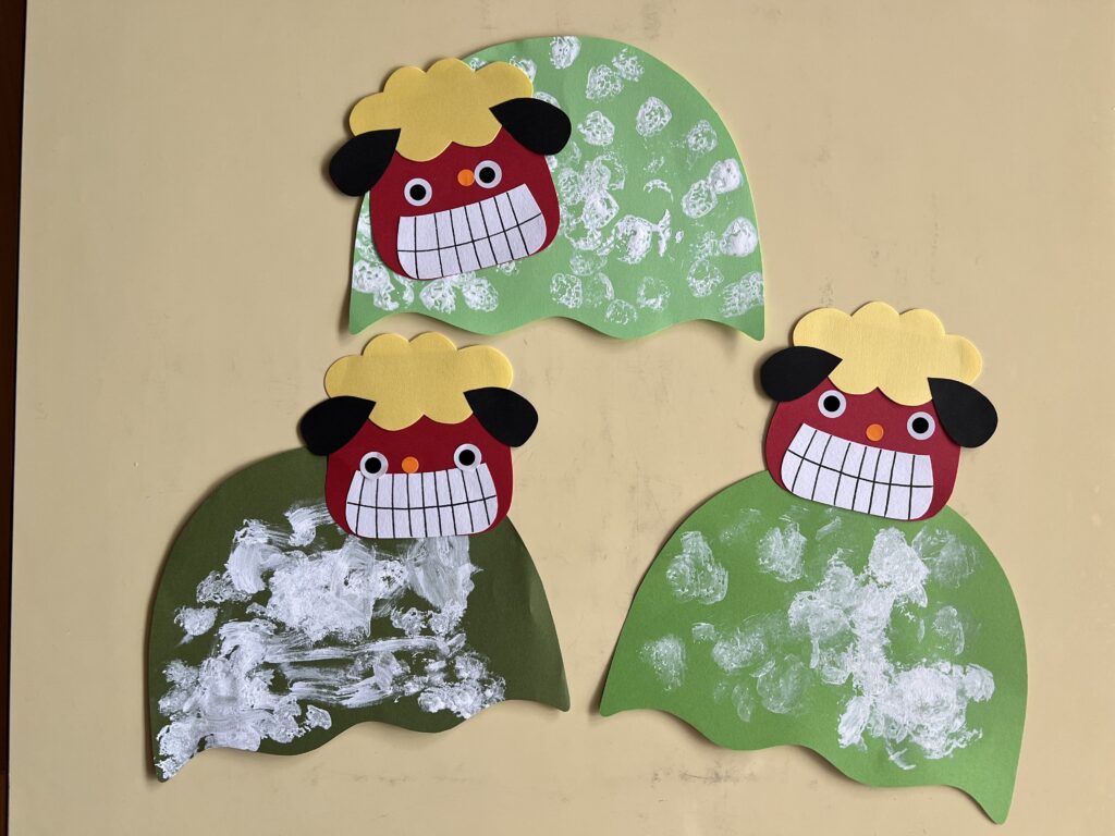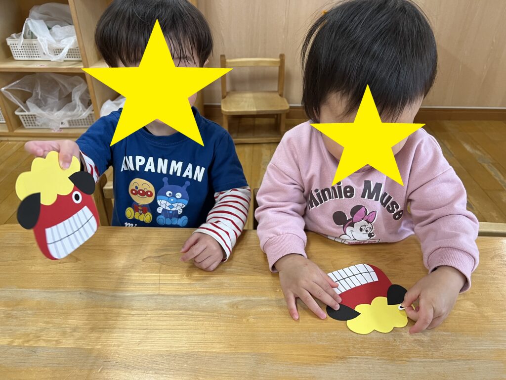 先日、お正月飾りの獅子舞を作りました。「ポンポン」と言いながらスタンピングをして、画用紙に絵の具がつくと「おおー!」と喜んでいた子どもたち。自分たちで目や鼻を貼って、からだと顔を貼り合わせ、獅子舞が完成するとうれしそうにしていましたよ。