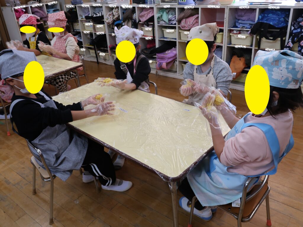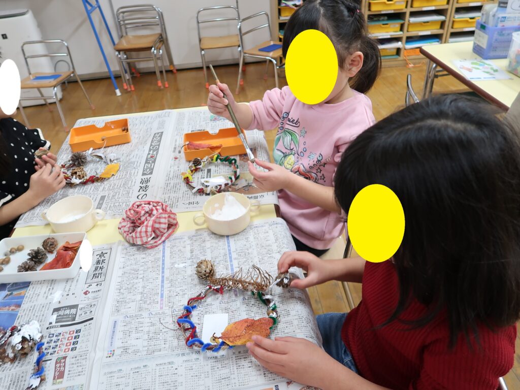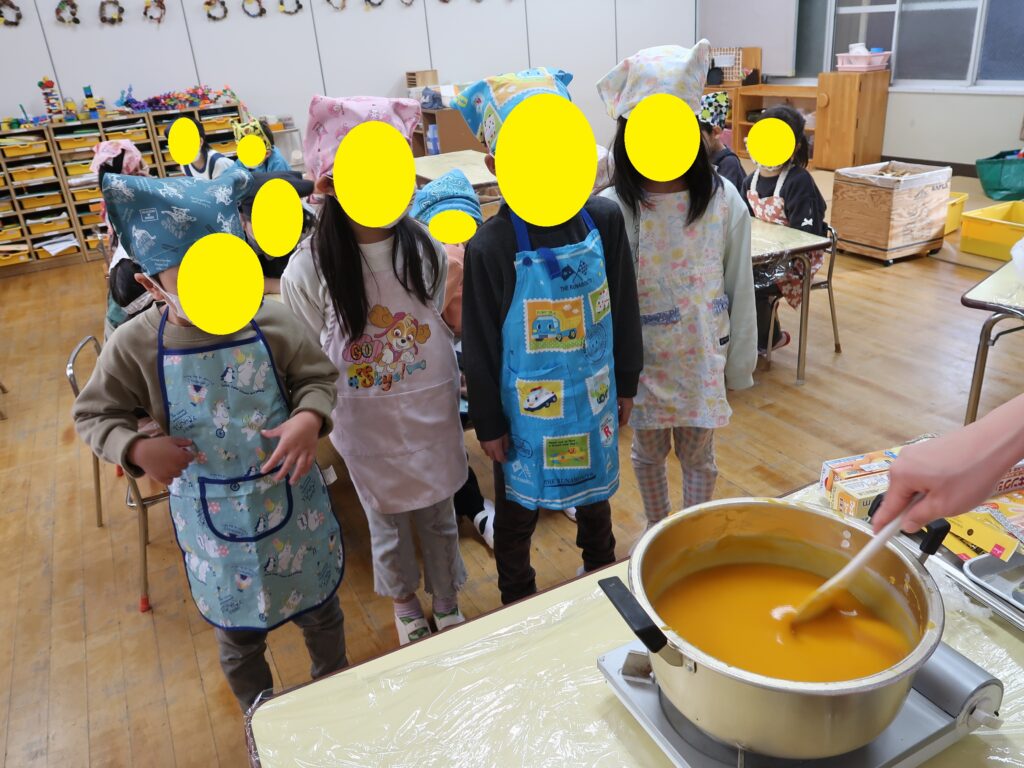 12月はクリスマスリースを作ったり、みんなで育てたかぼちゃでクッキングをしました。リースの土台は、以前収穫したさつまいものツルを使って作りました。みどりの広場で拾ったどんぐりや落ち葉も飾りつけました。クッキングは、かぼちゃの実がしっかり詰まっていてみんな、びっくり!かぼちゃのスープも「おいしー」とゴクゴク飲んでいました!