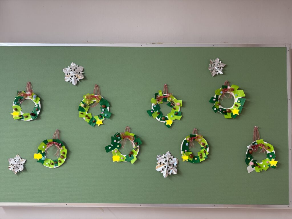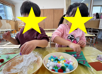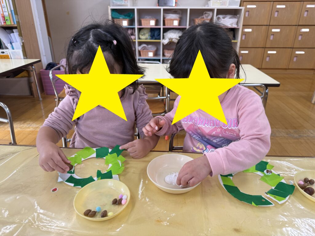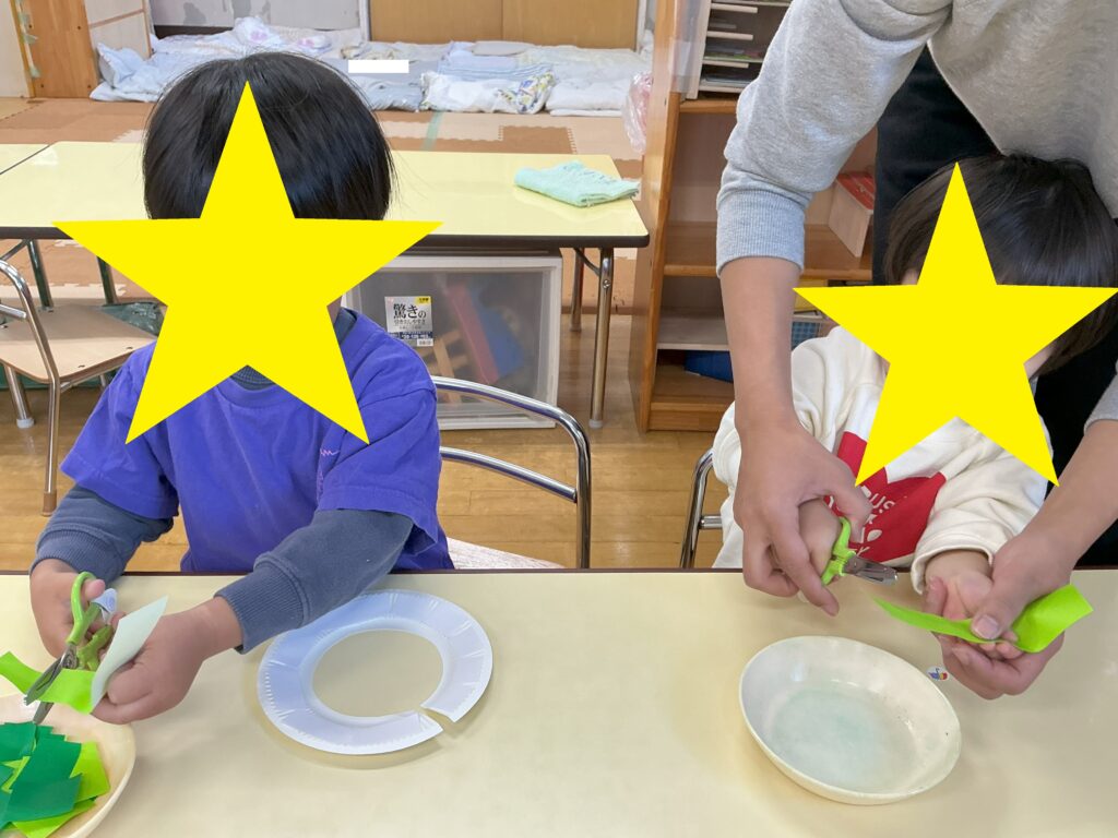 クリスマス製作で初めてはさみを使いました。保育者がはさみの使い方を説明すると真剣な眼差しで話を聞いてくれた子どもたち。実際に使ってみると難しそうにしている子もいましたが、保育者が一緒に手を持ちコツを知らせることで切ることができました。切った折り紙を紙皿に貼り、ボンドで装飾をつけリースの完成!保育室に飾ったリースを見て、うれしそうに「サンタさんみてるかな~」と言う姿がかわいかったです。